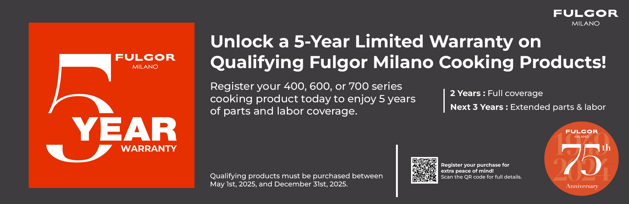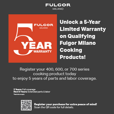 Unlock a 5-Year Limited Warranty on Qualifying Fulgor Milano Cooking Products! Register your 400, 600, or 700 series cooking product today to enjoy 5 years of parts and labor coverage. 2 Years: Full coverage Next 3 Years: Extended parts & labor *Restrictions apply