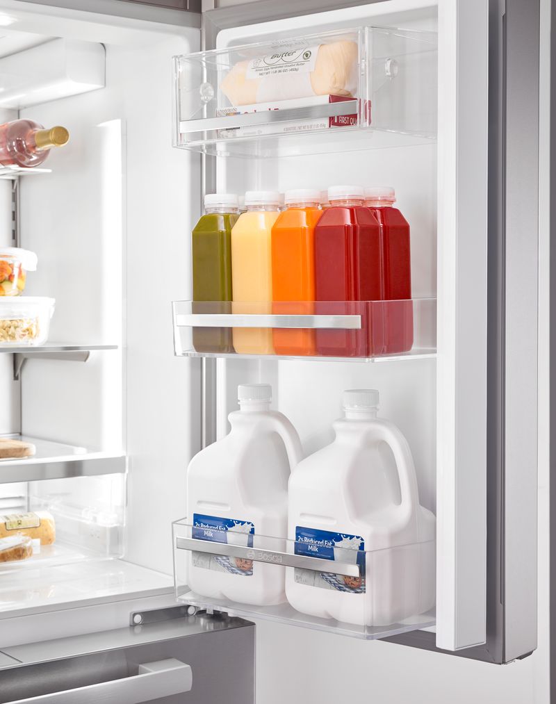 Transparent door bins frame the interior of the refrigerator, creating ample space for all of your needs. This refrigerator boasts six door bins total, three of which are wide gallon door bins, easily accommodating two one-gallon containers each.