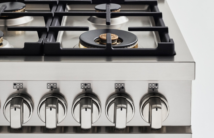 The high-efficiency maintop with 5 burners features a dual ring 19,000 BTU power-burner that boil water in under 6 minutes (best in class), and 4 additional MonoBloc burners of variable size and power to suit every style of cooking, with delicate simmer at 750 BTUs.