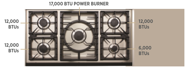 - One center 17,000 BTU brass burner, three 12,000 BTU brass burners and one 6,000 BTU brass burner