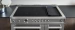 This all-new induction range has 6 high-power heating zones with maximum power output of 3700W. The right-side heating zones can be bridged to create a larger cooking area. Each induction area is controlled with knobs and has a convenient read-out interface on the glass worktop. A large, removable cast-iron griddle is included.