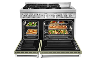 Satisfy your craving to create with a 48-inch KitchenAid® Commercial-Style Range with Even-Heat™ Chrome Electric Griddle. This dual fuel range combines an electric double oven with a 6-burner gas cooktop. Two 20,000 BTU Ultra Power™ Dual-Flame Burners offer power and precision to successfully sear, simmer, stir-fry and sauté. Even-Heat™ True Convection helps you achieve more consistent baking and roasting.