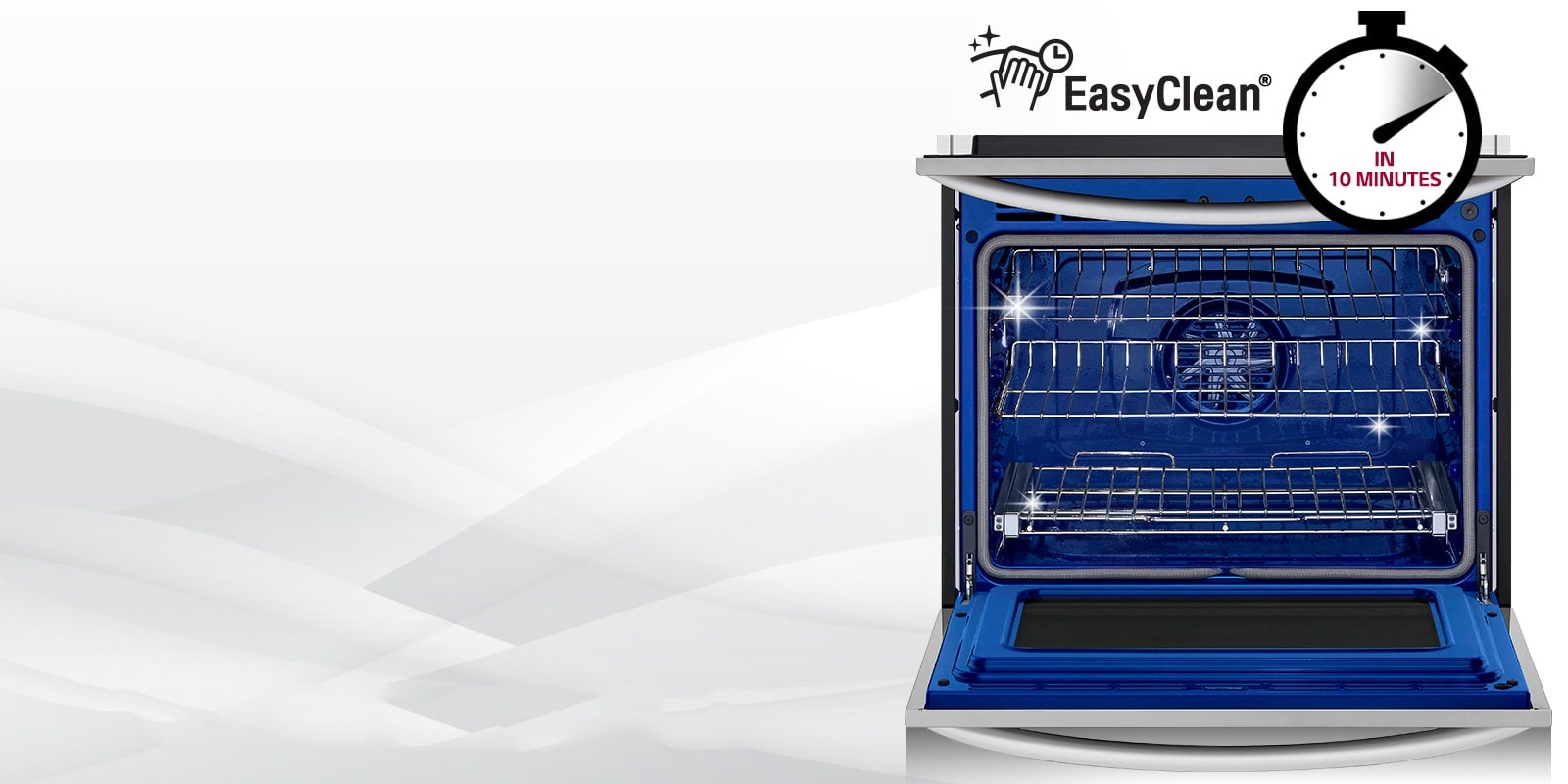 Got 10 minutes? In three easy steps and 10 quick minutes your oven can be sparkling clean, all without strong chemical fumes or high heat*. Simply spray the oven interior with water, press EasyClean and then in 10 minutes, quickly wipe away any leftover grime.