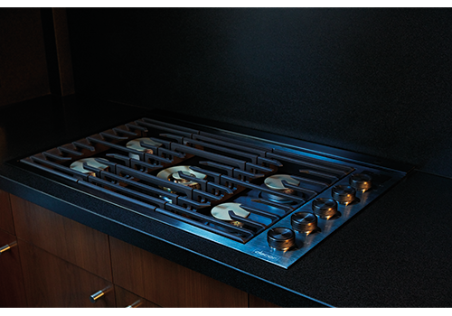 Our Gas Cooktops are designed to stand out while seamlessly integrating into the countertop. Finished in an easy-to-clean, heat-resistant, diamond-like carbon coating, and equipped with a central dual-stack, sealed brass burner for powerful performance and control.