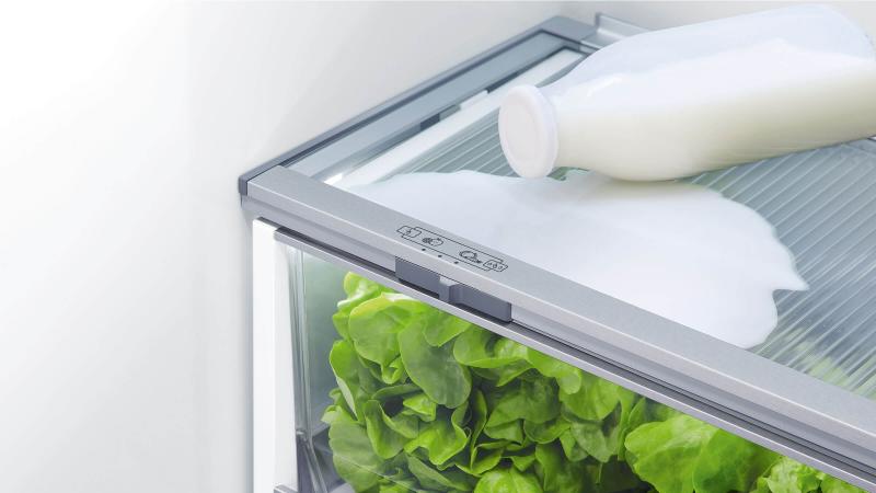 No more permanent dirty marks with our EZKleen feature for stainless steel fridges. Anti-fingerprint coating means you simply wipe clean any marks. Spill-safe secure glass shelves easily capture any drips or leaks.