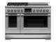 This range has craftsmanship in every detail, with real stainless steel, cast-iron trivets, and beautifully weighted, halo illuminated dials. Each cavity features incandescent lights and full extension telescopic racks. From the robust legs to the powerful cooktop, this Range is built to last.