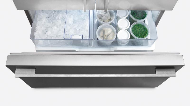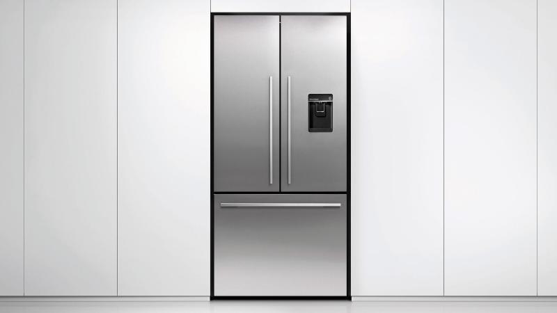This Fisher & Paykel French Door refrigerator with ice and water, offers large flexible space in a stylish stainless steel finish.