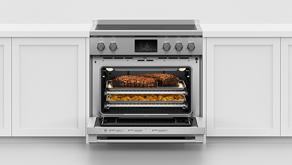 The oven features a self-cleaning function and self-clean proof side racks, which don't need to be removed when using this function. The durable induction cooktop surface only needs a quick wipe after use to keep it clean.