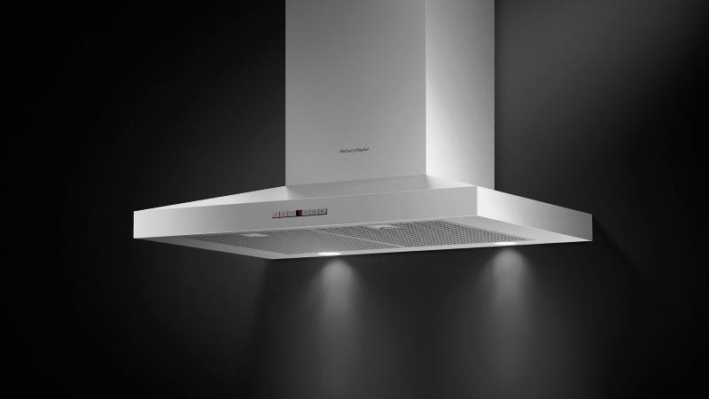 This Fisher & Paykel 30 ventilation hood's pyramid design is a stylish addition to any kitchen.