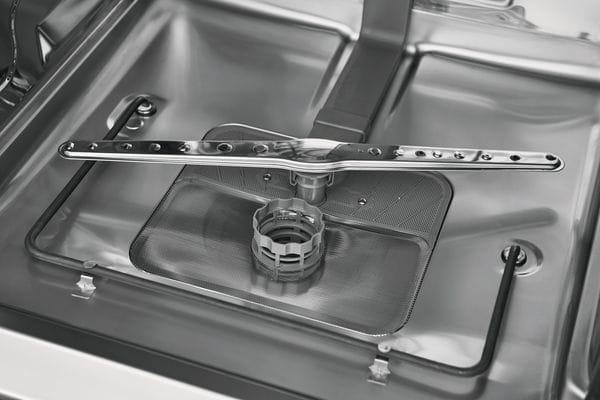 Removable, self-cleaning filter eliminates food particles, keeping dishes clean.