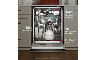 Say hello to the only way to dish. 50+ Total Wash Jets across 5 wash arms offer targeted cleaning across the entire 7.25 cu.ft. MaxTub Largest dishwasher Tub*. 360° Max Jets™ Third Rack uses 360° wash jets to clean glasses, mugs and bowls. ProDry™ System dries from every angle with heating elements, water repellent tech and natural ventilation. True Self-Cleaning Filtration eliminates manual filter cleaning by continuously circulating clean water during wash and rinse cycles