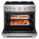 satisfies the needs of the most demanding cooks by combining the precise control of a gas cooking surface and the even baking, roasting and broiling of an electric oven.