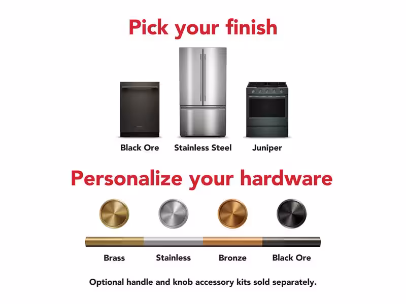 with a curated palette of exterior finishes and mixed metal hardware. Pick from lush Juniper, warm Black Ore and classic Stainless Steel finishes, all with matching handles. Personalize your hardware with optional handle accessory kits in Brass, Bronze, Black Ore and Stainless Steel.