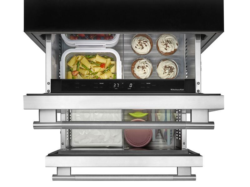features two deep drawers that help organize drinks, side dishes, frozen snacks, and more. The refrigerator drawer temperature can be adjusted from 32°-42°F and the freezer drawer temperature can be adjusted from -8°F-6°F.