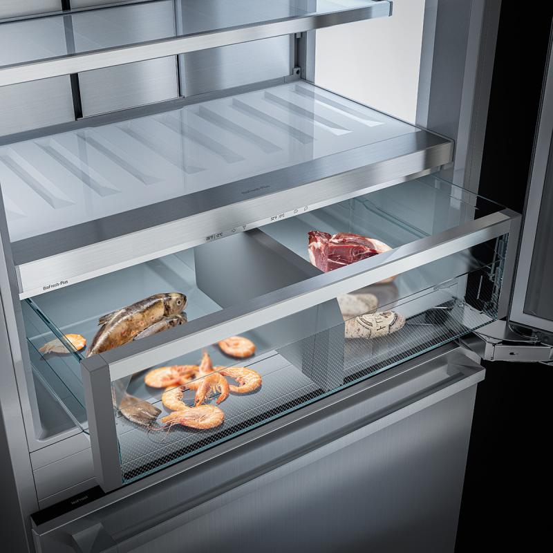 The BioFresh Plus Safe guarantees you a perfect storage climate and extra-long freshness of fruit and vegetables, meat and dairy products as well as fish and seafood – all in just one compartment. Depending on the food, the Meat & Dairy safe can be divided into various temperature zones from just over 0 °C (32 °F) to an icy -2 °C (28 °F).
