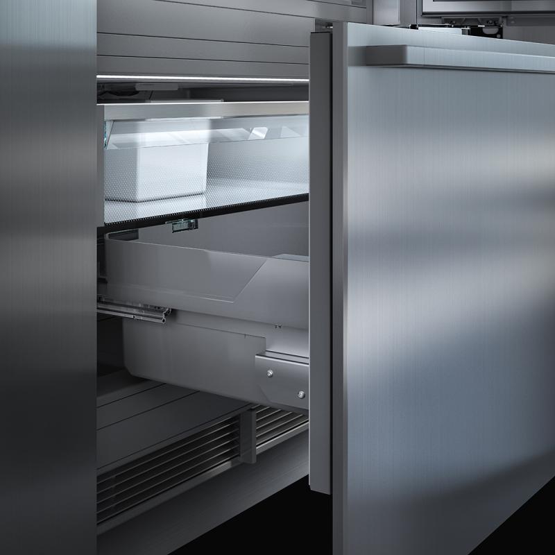 Opens and closes safely and comfortably. The convenient self-closing mechanism with soft closing for the freezer drawers in the Monolith makes daily use practical and safe. The telescopic rails let the drawers gently slide towards you. And because it extends all the way, you have a perfect view of the contents.