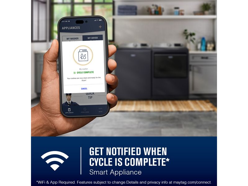 Stay on top of laundry with end of cycle notifications on your smart device to ensure finished loads aren’t left behind.*WiFi & App Required. Features subject to change. Details and privacy info at maytag.ca/connect.