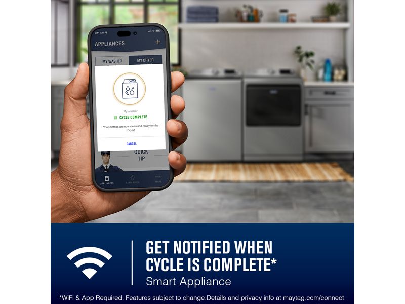 GET THE MAYTAG™ APP to stay in control and efficiently manage laundry from anywhere.*Stay on top of laundry with end of cycle notifications on your smart device to ensure finished loads aren’t left behind. Get step-by-step pretreating instructions in the Stain Guide to take on everyday tough stains and maximize the power of your Maytag® appliances.*Appliance must be set to remote enable. WiFi & App Required. Features subject to change. Details and privacy info at maytag.com/connect.