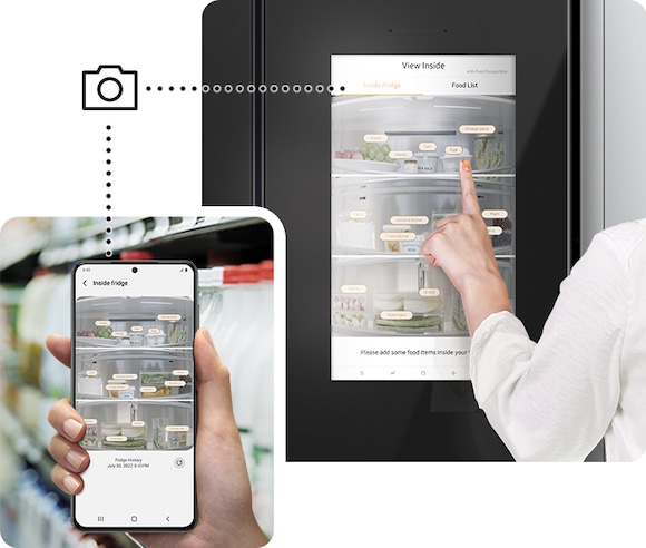 See what’s in the fridge using the SmartThings App* or the home screen. View Inside internal cameras let you check available food items from anywhere. Using an upgraded food recognition system, it also automatically tags food types and lets you create shopping lists, food memos or reminders.