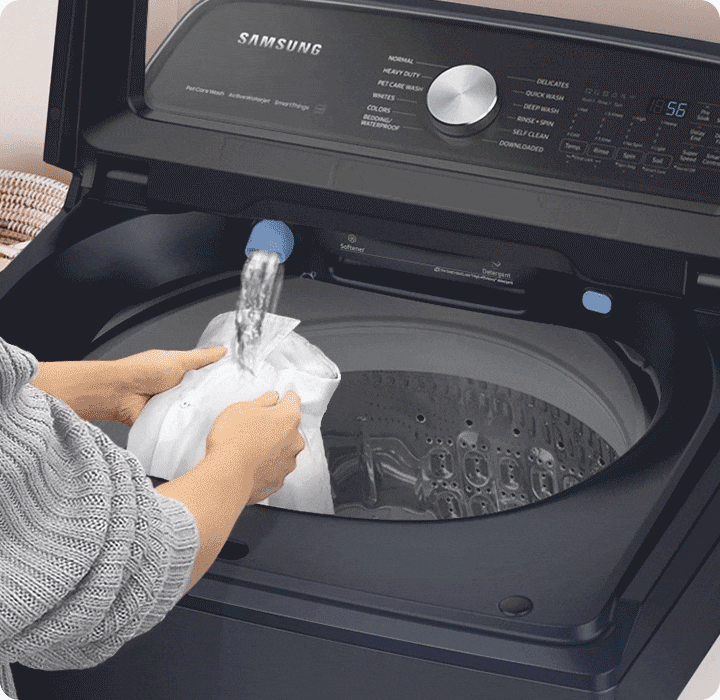 * As compared to Samsung model WA7700A. Based on internal testing on a 8lb load containing 1g of dog hair. The WA7700A using a Normal cycle removed 4% of pet hairs and the WA7150C using the Pet Care Wash cycle and Pet Hair Filter removed 24% of pet hairs. ** Based on internal testing of the rinsing ratio, which measures the water’s electrical conductivity to assess the amount of detergent remaining before and after rinsing. The rinsing ratio using the Pet Care Wash is 1.05 compared to 0.402 with a Normal cycle, which is a 2.6 times better rinsing performance. *** Tested by Hanyang University based on Samsung internal protocols. Results provided to and interpreted by Intertek and Witness Report provided on April 18th 2023. Tested using IEC A* detergent and an IEC 8lb load containing a 10x10cm fabric specimen polluted with hair, dead skin and dust from dogs and cats. Result: removed 99% or more of the dog/cat allergens tested. Dog allergens (Can f 1) had an average input of 462.0 ± 41 ng/mL and an average output of 2.6 ± 1.5 ng/mL. Cat allergens (Fel d 1) had an average input of 67.2 ± 3.7 ng/mL and an average output of 0.2 ng/mL or less. Results may vary depending on actual usage conditions.