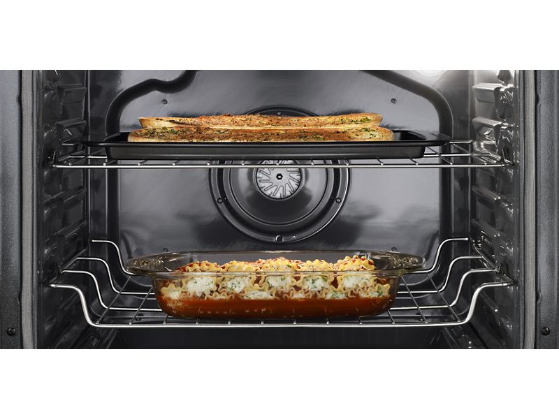 Cook meals with a fan in the back of the oven that distributes hot air more evenly than traditional baking, so you can bake on multiple racks at once.