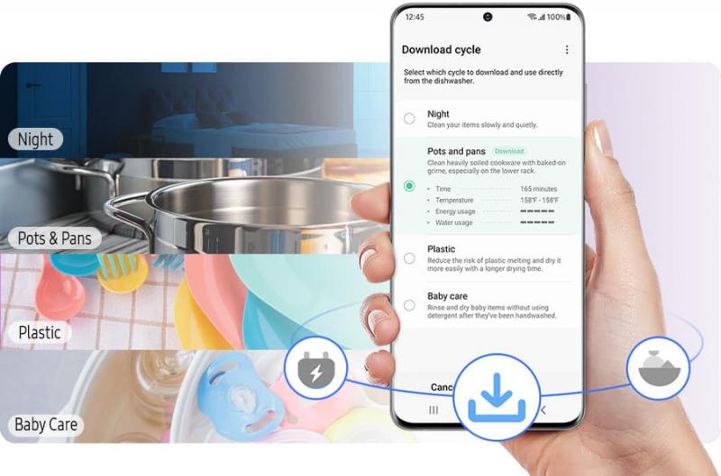 Customize your cleaning experience whenever you want. The Download Cycle option lets you choose from 4 additional specialist programs and instantly download the one you want using the SmartThings App* on a smartphone. Simply select the 'Plastic', 'Pots & Pans', 'Baby Care' or 'Night' cycle.4