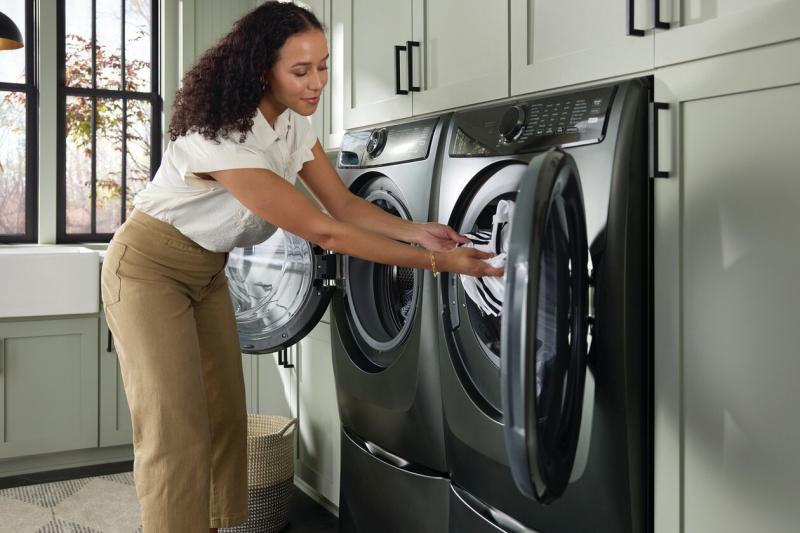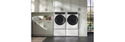 Sleek matte white finish with contrasting dark trim offers a modern, smudge-resistant look that elevates your laundry space
