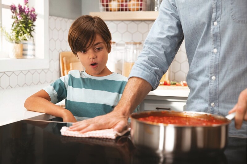 Unlike traditional electric and gas cooktops, Induction only heats the pan and the food in it, so the area around the pan stays cooler, allowing you to clean up spills and splatters while you cook.
