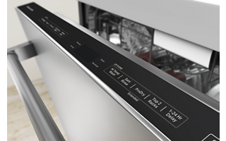 are tucked away on top of the dishwasher door for a clean look to match your kitchen style. An indicator light on the front of the door changes colors to subtly display cycle progress.
