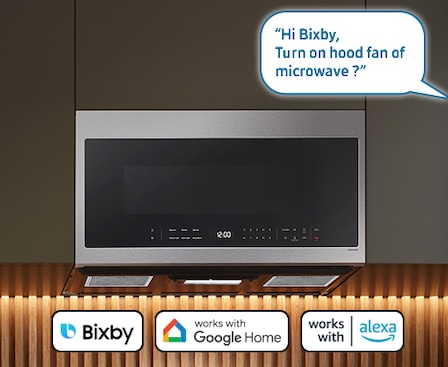 Monitor the microwave and cook with just your voice. Using a voice assistant*, like Samsung Bixby**, Amazon Alexa*** or Google Assistant****, you can check its status or control it. You can also tell Bixby what dish to cook***** and it sends the recipe to the microwave to cook it automatically.