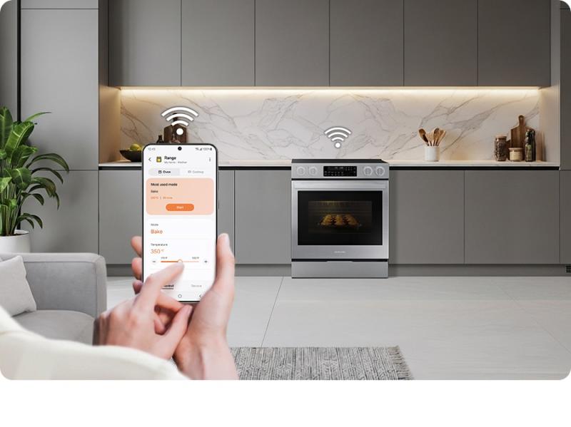 Enjoy added convenience and peace of mind with embedded Wi-Fi. The SmartThings App* lets you monitor and control the oven anywhere using a smartphone. You can check and adjust settings and receive alerts. You can also control it with your voice using a voice assistant**, like Samsung Bixby***.