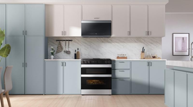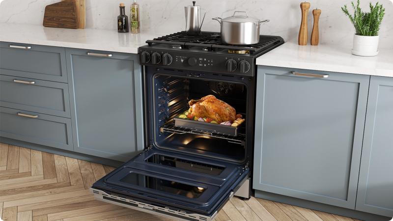 * Available on Android and iOS devices. A Wi-Fi connection and a Samsung account are required. ** This feature is only compatible with the oven section of the range. *** How thoroughly each dish is cooked may vary depending on the type and weight of ingredients.