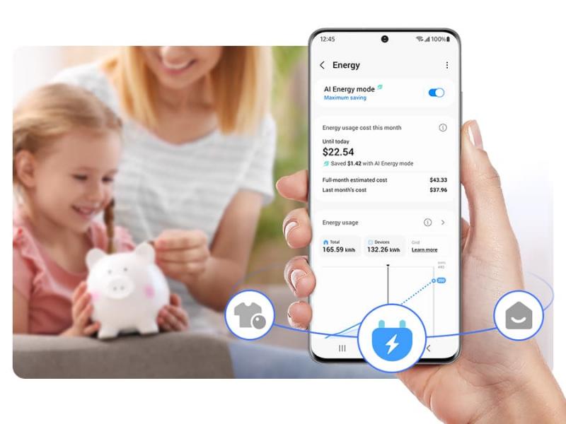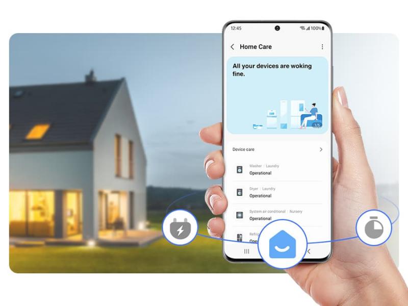 * Available on Android and iOS devices. A Wi-Fi connection and a Samsung account are required. ** SmartThings Energy currently works with around 40 Samsung home appliances that are SmartThings enabled. These include washing machines, clothes dryers, dish washers, air conditioners, air purifiers, vacuum cleaners, ovens, hoods, cooktops, microwave, TVs (from June 2022) and energy meters.