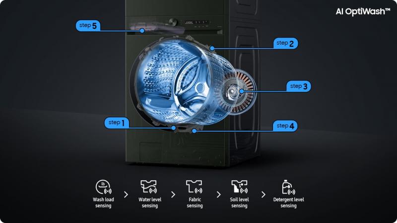 * Available on Android and iOS devices. A Wi-Fi connection and a Samsung account are required. ** Can be applied on AI OptiWash, Super Speed, Small Load, Towels, Heavy Duty, Power Rinse cycle only when the selected washing temperature is 'hot'. *** Based on internal testing on the WF8900B model with IEC 8lb load except for Small Load cycle (IEC 4lb load). Results may vary depending on the actual usage conditions. **** It may reduce the washing performance on an AI OptiWash cycle with light laundry to support fabric care.