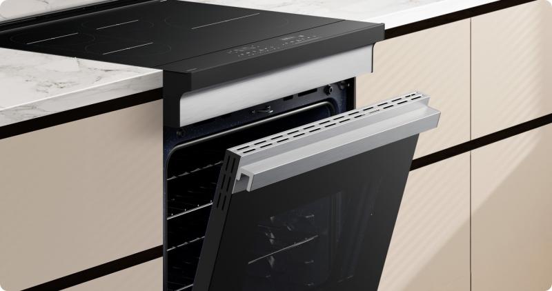 Enhance the look of your kitchen with a clean and clutter-free styling that will blend seamlessly with your kitchen. The oven’s modern design has a minimalist exterior, with a flat door. Its simple and sleek look is accentuated by a modern flat handle design.