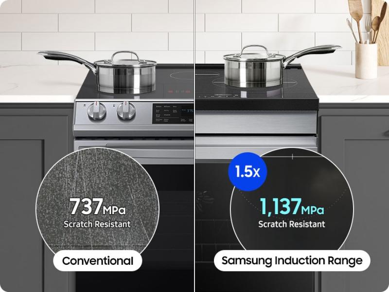 * Based on testing by Samsung in accordance with ASTM G133-95, compared to the Samsung model NE63B8611SS/AA with conventional glass. Results provided to and interpreted by Intertek. The test involves scratching on the cooktop with a stainless steel ball, with a 6mm diameter and made of SUS304 material, back and forth 10 times with increasing pressure (MPa), and then checking the surface with both the naked eye and a microscope to determine when a scratch is visible. ** Based on testing by Samsung in accordance with ASTM G133-95. Results provided to and interpreted by Intertek. The test involves sliding a pot weighing 3kg weight across the cooktop 100 times and by sliding sandpaper with a grit size of 1000 and weighing 1kg across the cooktop 10, 50, 100 and 1000 times.