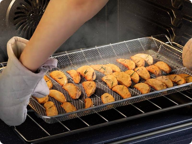 Enjoy healthy fried food without a deep fryer. Air Fry combines a special tray with hot air circulation that envelops food. It is the ideal way to cook French fries, Tater Tots or even vegetables as it eliminates excess fat, but everything is still crispy and brown outside and juicy inside.