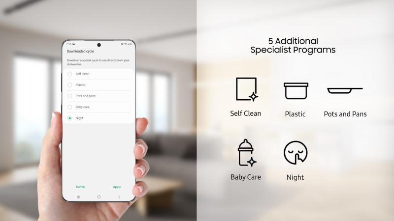 Customize your cleaning experience whenever you want. The Download Cycles option lets you choose from 5 additional specialist programs and download the one you want using the SmartThings App*. Simply select the “Night”, “Self Clean”, “Pots and Pans”, “Plastic”, “Baby Care” cycle.