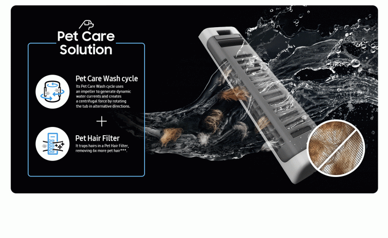 Keep your clothes and your pet's bedding clean. Remove 6X time more pet hair* with a new Pet Care Wash Cycle. The cycle creates dynamic water currents that enable better stain and allergen removal while loosening hair to be trapped by dual pet hair filters. The dual pet hair filters removes up to 6X of pet hair compared to machines without pet hair filter. * The new Pet Care Wash Cycle improves rinse performance by 2.6x **. It also eliminates up to 99% of dog/cat allergens. ***