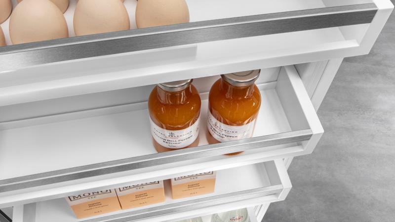 Where did I put that little packet of yeast? And where's the tube of mustard? To easily find the small items in the refrigerator, there are the VarioBoxes. They keep everything clearly arranged and organized in the inside door. Their transparent design means you immediately see what's inside. The boxes are easy to remove – and thanks to the pull-out stop, nothing will fall to the floor, guaranteed.