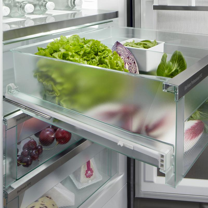 Look forward to opening your BioFresh safes. And this is not just because of the fresh food – but also because opening is so easy, and closing is automatic and cushioned. The telescopic rails slide the safe gently towards you. And because these extend fully, you have the best overview of the contents.