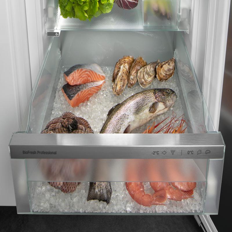 Love fish? Your Liebherr keeps fish fresh! The Fish & Seafood Safe stores fish and seafood at the optimum temperature of -2 °C; as professionally as your fishmonger. Adjust the size of the -2 °C zone as much as you want – and store the remaining meat and dairy products at the optimum 0 °C. An LED display indicates that the -2 °C zone is currently active.