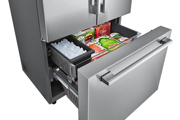 Store More. Stock-up and store everything you need. With a cavernous 27 cubic feet of space, this LG French Door refrigerator gives you ample space for all of your family’s favorite foods and keeps them conveniently organized and within reach.