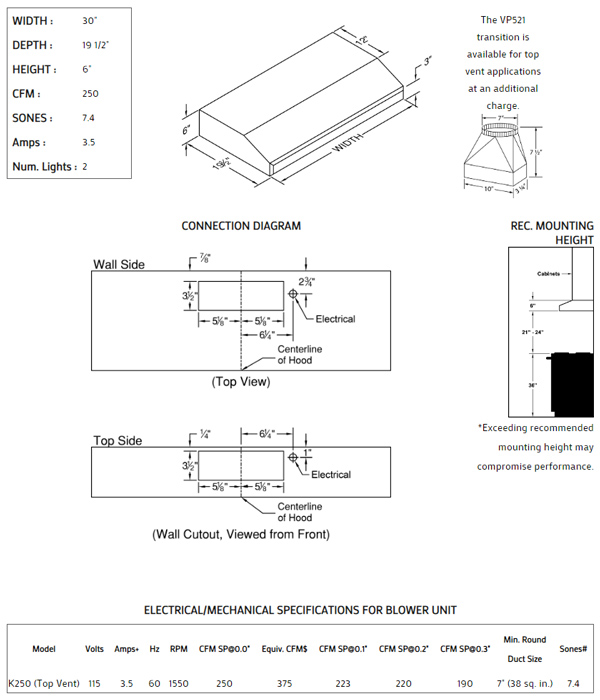 With Emerald Lip styling, this 6" tall ultimate replacement hood features our exclusive Power Lung and "Active Canopy" technology, which captures cooking vapors from all areas of the canopy. Includes the K Series Blower (sound rating is 7.4 sones at high speed). The hood includes SensaSource, halogen lighting, and top vent/back vent capability. Standard widths are 24", 30", 36", and 42" wide. This hood is only available in Black, Biscuit, Gunsmoke, White, or Stainless Steel finishes. Recommended mounting height is 21" - 24" above the cooking surface. All Vent-A-Hood products are suitable for use in damp locations (outdoor applications such as a covered patio) when installed in a GFCI protected branch circuit.