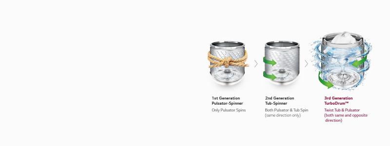 TurboDrum™ which spins the tub and the pulsator in the same or in opposite directions, generates water currents that rotate both clockwise and counterclockwise