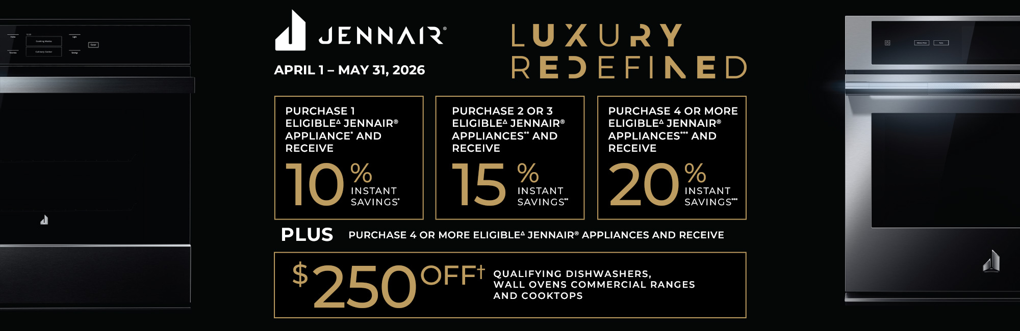 Purchase 4 Or More Eligible Jennair® Appliances And Receive $250 off on Qualifying Dishwashers, Wall Ovens Commercial Ranges And Cooktops